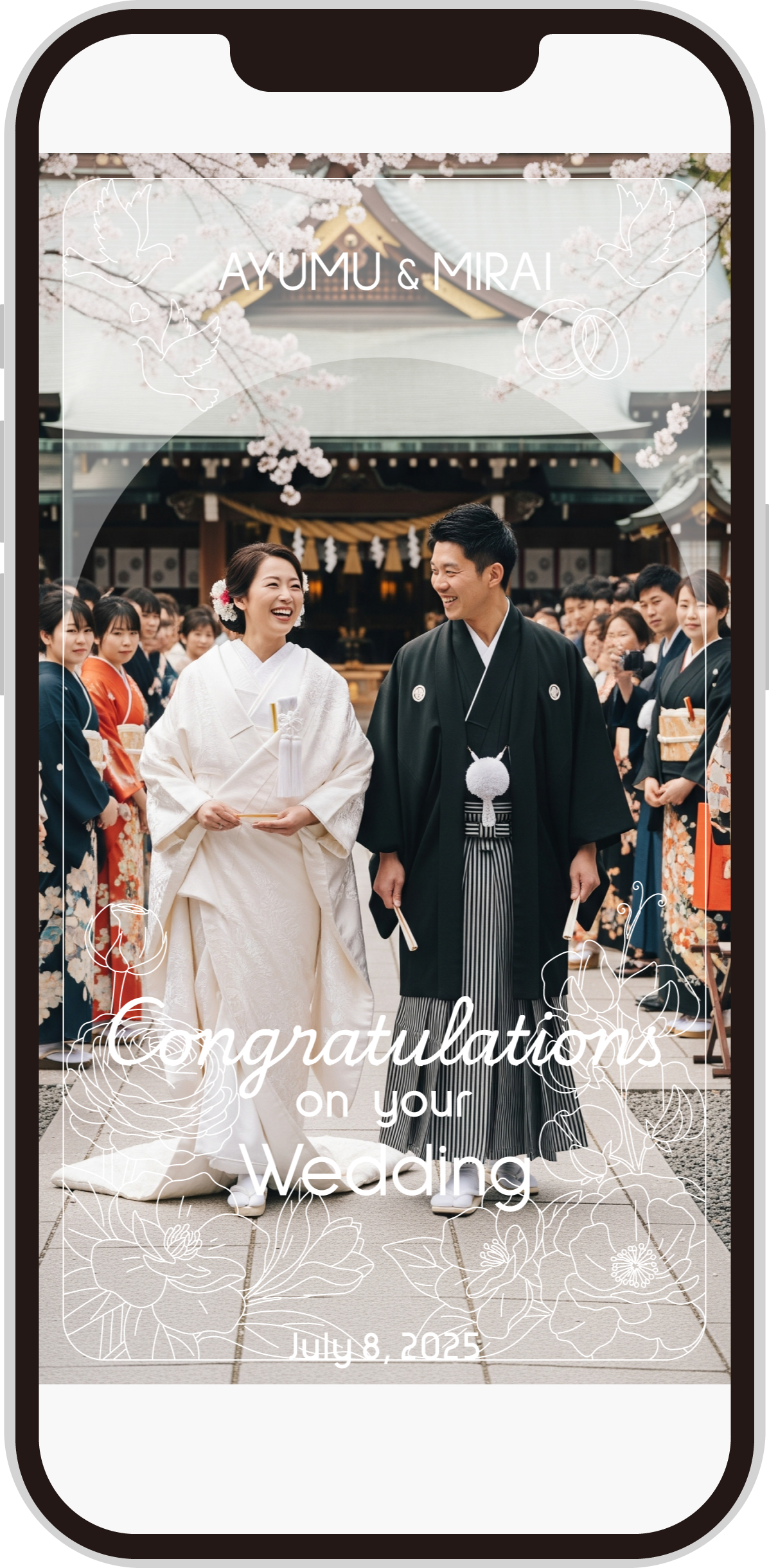 新郎新婦のお名前と日付を入れることができます。忘れられない一日を華やかに彩る記念フレームにぴったり。