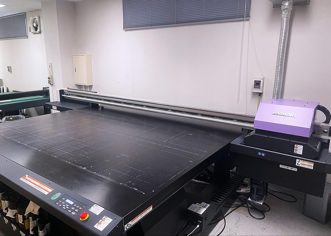 これは、大きなポスターやパネルを印刷したり、紙以外の素材であるステンレス看板やトートバッグに印刷するのが得意な「UVインクジェットプリンタ」です。