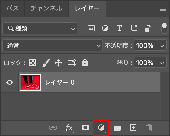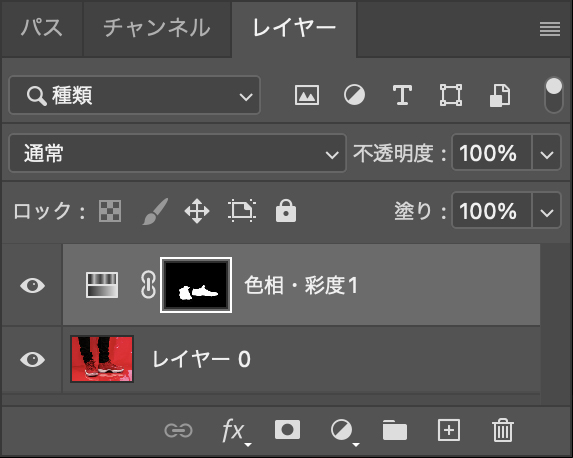 - 選択範囲を指定した状態で、レイヤーパネルから「調整レイヤー」ー「色相・彩度」を新規作成する。