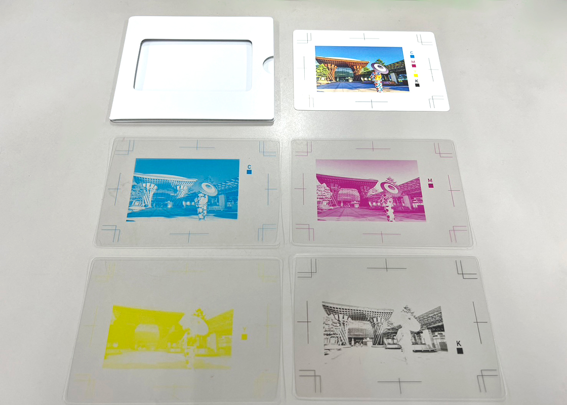 上から順に、カラー印刷された見本の紙と、それぞれ青色(シアン)、ピンク色(マゼンタ)、黄色(イエロー)、黒色(ブラック)の単色で印刷された透明シートがあります。