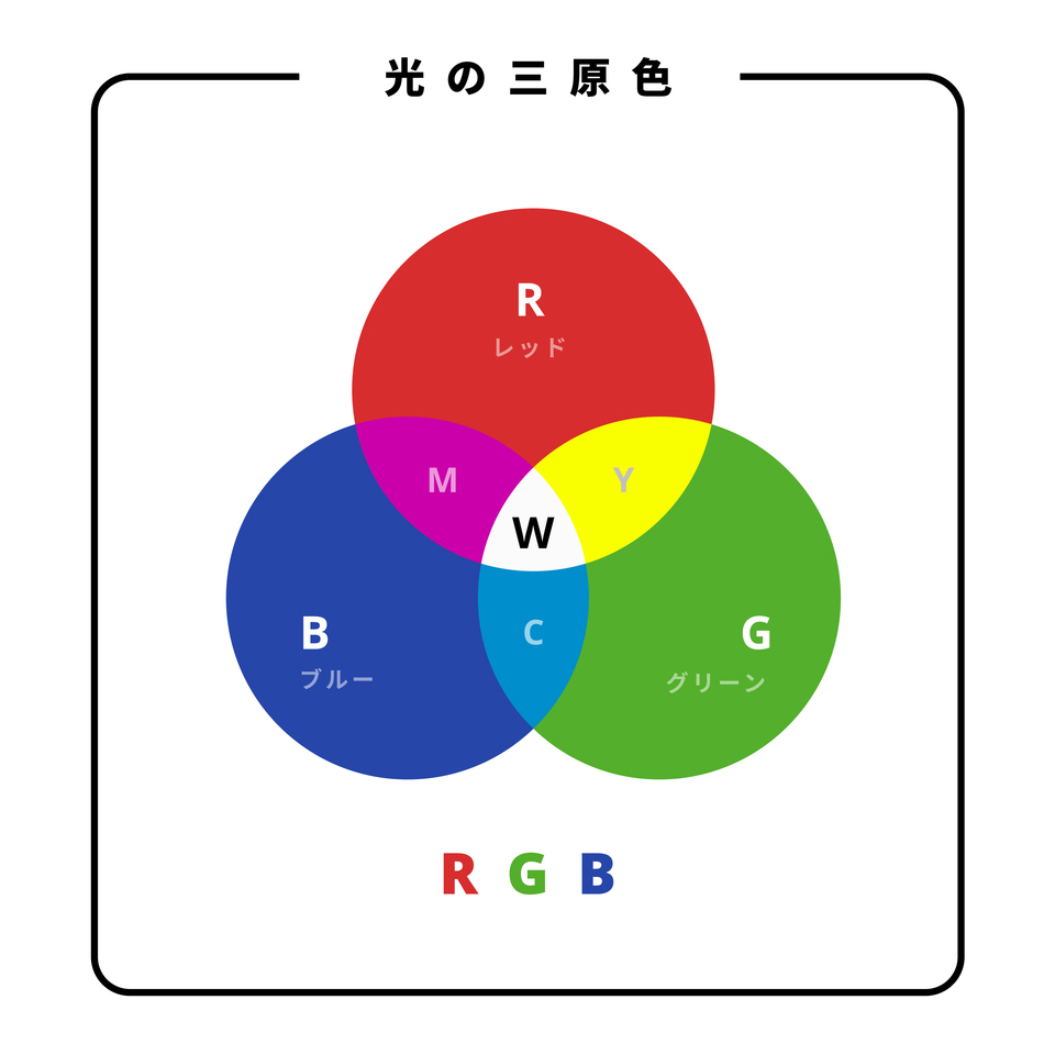 Webサイトやテレビ等の映像といったデジタル表示は、赤色(レッド)、緑色(グリーン)、青色(ブルー)の3色(光の三原色)を組み合わせています。