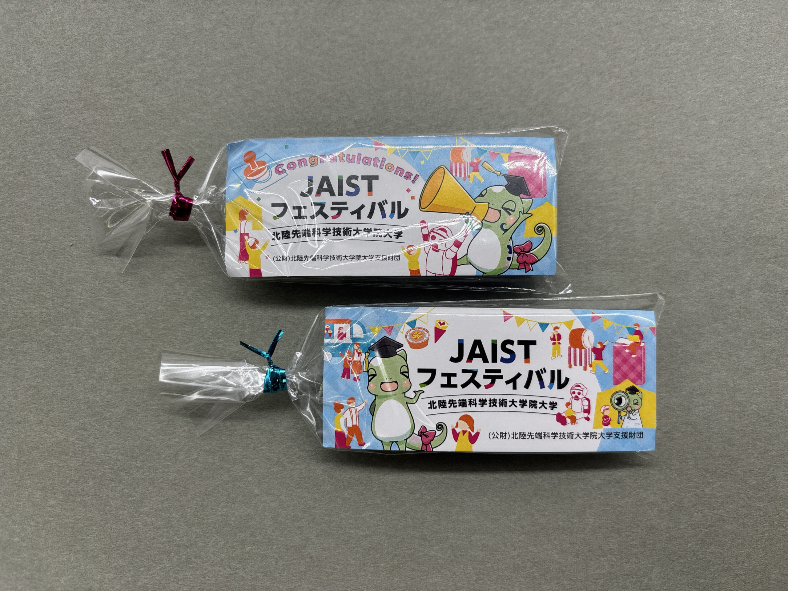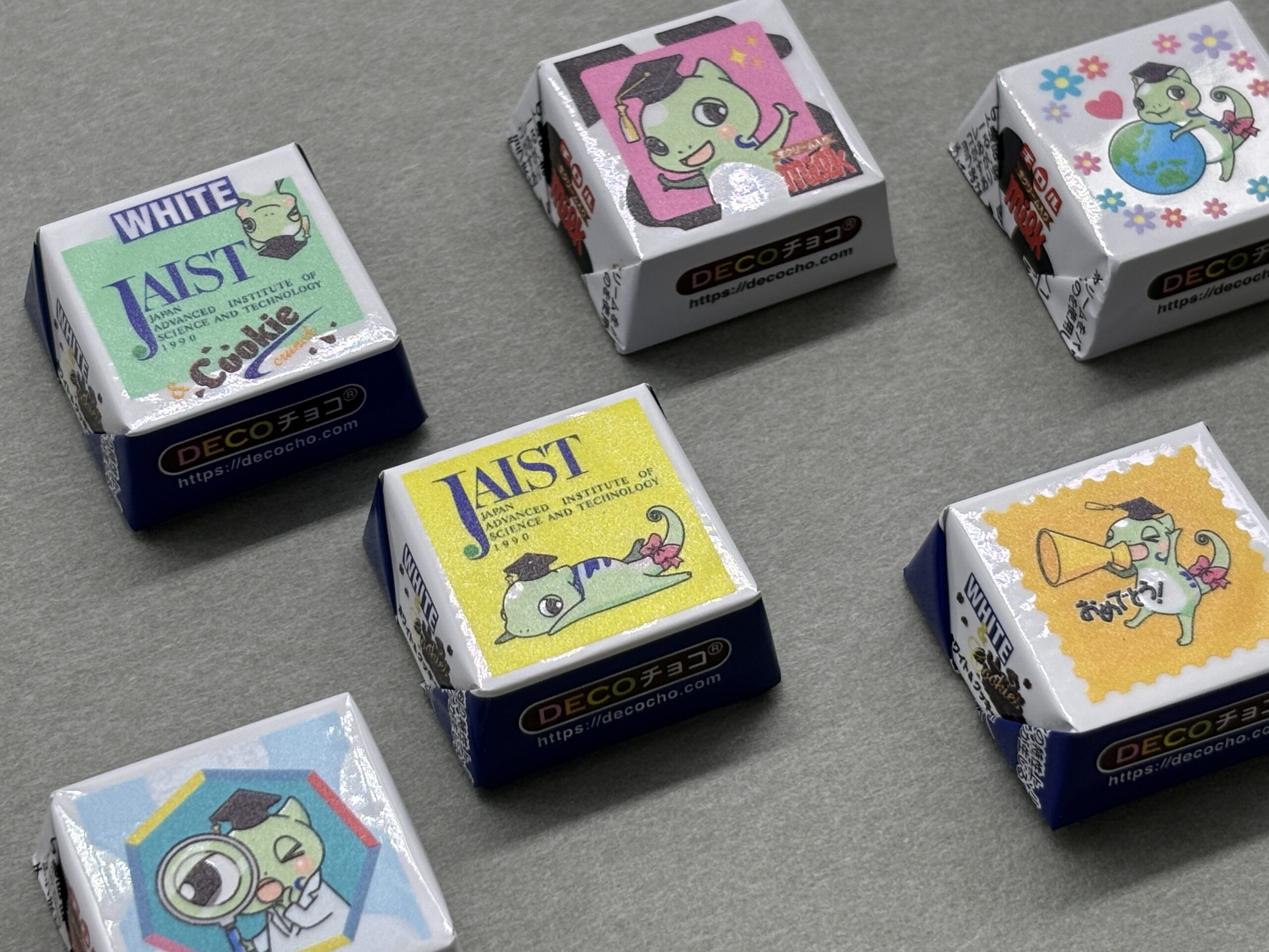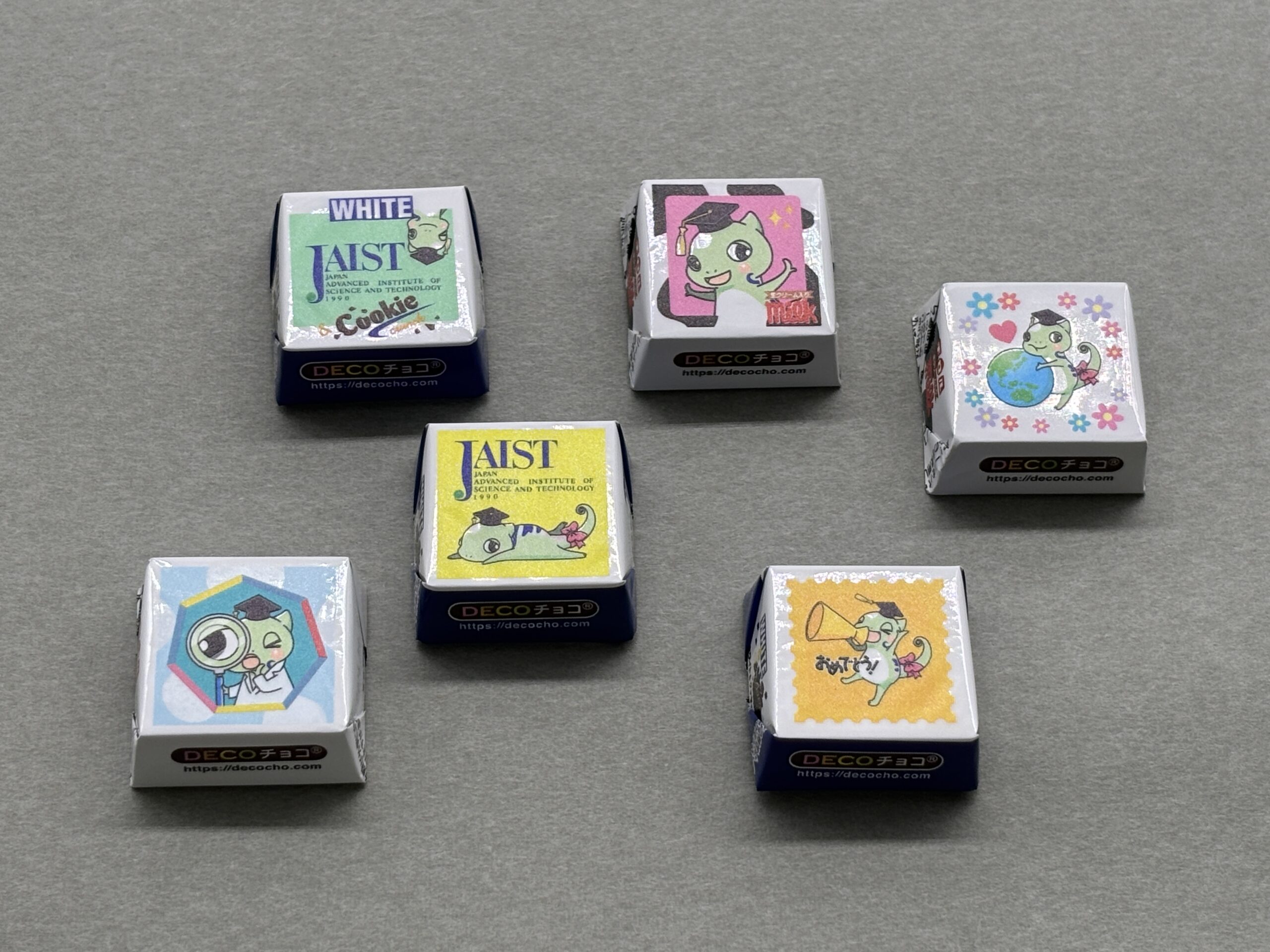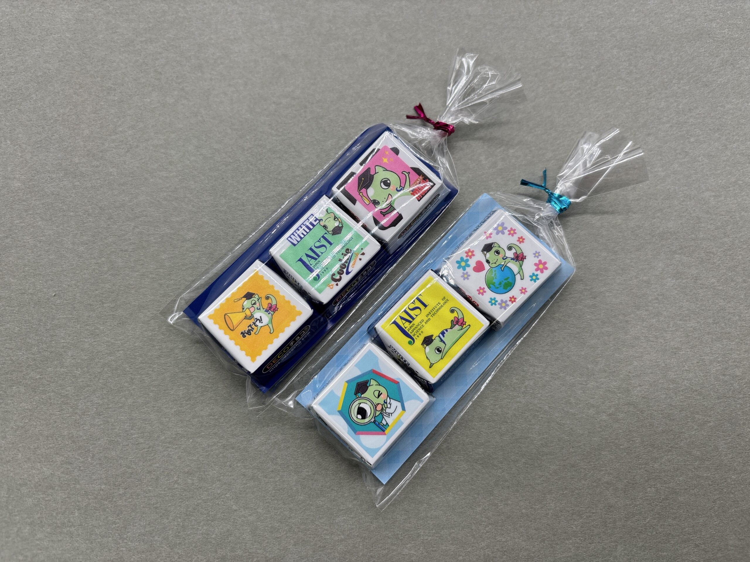DECOチョコのサービスを利用して、大学のマスコットキャラクターを入れたチロルチョコのパッケージを作成しました。3個セットとしてイベントの景品として配布されました。